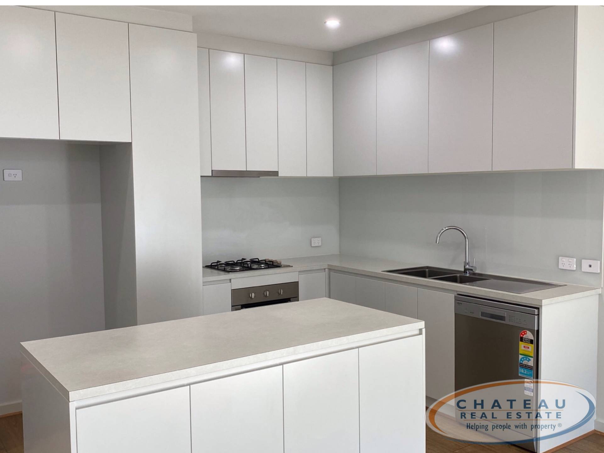 - Modern kitchen has gas cook top, electric oven, stone bench tops, double sink and dishwasher